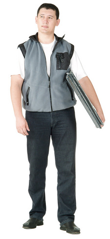 Жилет имеет застежку-молнию, вместительные боковые и один нагрудный карман, воротник-стойку.